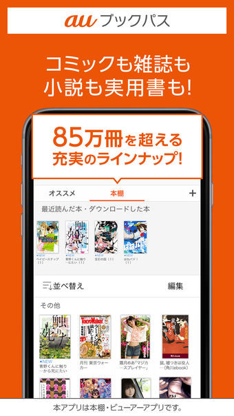 auブックパス هو خدمة كتاب إلكتروني تقدم تشكيلة متنوعة تضم أكثر من 850،000 كتاب، بما في ذلك الكوميكس الشهيرة والروايات. إنها خدمة تقدمها شركة au، ولكنها متاحة أيضًا للعملاء غير العملاء لشركة au. تطبيق الكتاب هذا هو تطبيق رفوف الكتب الذي يتيح للمستخدمين الاستمتاع بالكتب الإلكترونية من auブックパス. يمكن للمستخدمين إنشاء رفوف الكتب وتصنيفها حسب رغبتهم. يتيح التطبيق للمستخدمين قراءة الكتب الإلكترونية عبر الإنترنت أو تنزيلها للقراءة دون اتصال بالإنترنت.